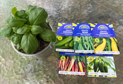 Then I went to Tractor Supply (yes, I know, but I have few choices here) and got a basil plant and seed packets.